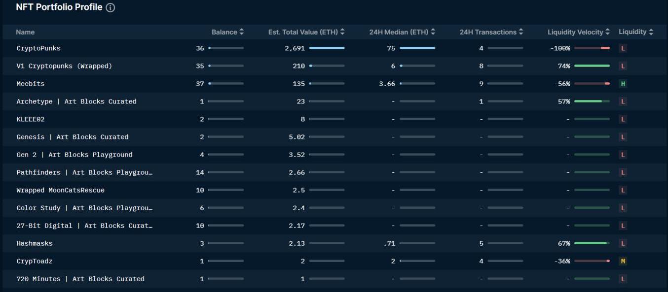 以下是使用WalletProfilerDashboard調查的一些最賺錢的鯨魚-moin3au.eth。Moin3au.eth是按利潤排名最賺錢的NFT錢包地址,他們的大部分收益都是通過著名的加密朋克CrpytoPunksNFT來交易的,將500ETH變成了1500ETH。該地址購買了356件藏品,迄今為止已售出其總藏品的60%。MeebitsNFT是moin3au.eth的另一個高利潤集合,Nansen的WalletProfiler對這個錢包的活動進行了全面的細分。顯示moin3au.eth決定獲利的NFT以及錢包中的NFT收藏品,該儀表板允許投資者復制最佳操作。