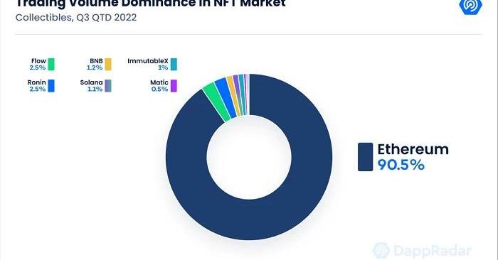 從2022年第三季度的鏈上銷售數量來看,情況有所不同,以太坊仍然是主導鏈,但僅占總銷售量的26.22%。從交易額和交易量之間的明顯差異可以看出,以太坊可能更多地吸引了部分“高端巨鯨級買家”,而其他區塊鏈則受到中小交易者的青睞。