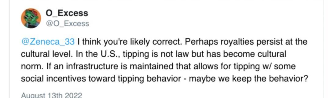 但前文所說,項目方沒有權利去限制用戶的交易場所,因此只能依靠著限制或是福利。如:對用戶的交易進行記錄,對于支付版稅的用戶給予獎勵,對于不支付版稅的用戶限制其一些權益等。但這種方法十分沒有Web3精神,中心化并且限制了用戶自由,除非獎勵能大幅度蓋過版稅,否則無論怎么設計都一定會引起大量持有者的不滿;以及以往的案例告訴我們這種“內卷”到最后的結果損害的一定是持有者的利益。