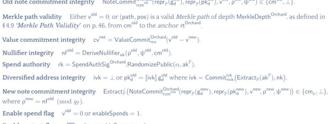 圖片來源?花費的note的完整性,和noteplaint唯一綁定?花費的note的有效性,cmtree的存在性證明?Value承諾的完整性,和rcv,oldvalue,newvalue唯一綁定?Nullifier的完整性,防止doublespend,維護一個花費的noteset?花費的note的合法性?地址的完整性?新note的完整性?flag的合法性2.5交易結構和示例