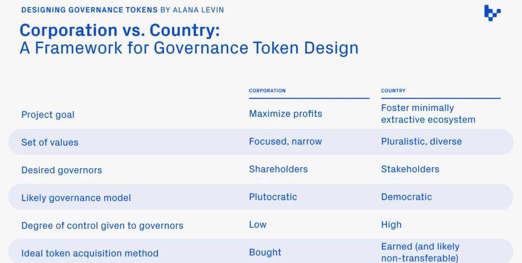 XRP/HKD-1.05%長期以來,我一直在為流動性治理代幣的概念而苦苦掙扎。我傾向于將協議視為國家,因此我會把每個治理投票視為類似于在選舉中投票。在這種框架下,通過購買流動性代幣來購買選票的想法似乎很荒謬——在選舉中購買選票是非法的,那么為什么它會成為Web3中獲取影響力的主要方式呢?我上述的觀點基于以下幾個核心假設:協議是網絡狀態,因此類似于國家治理影響力在很大程度上取決于獲取代幣的方法治理權讓代幣持有者對協議的未來方向有很大程度的控制權然而,很多Web3項目實際上并不符合這些假設。因此,為這樣的項目設計治理,毫不奇怪,是一個更加微妙的話題。問題是,我們看到該領域的許多項目都采用了一種一刀切的治理模式,而實際上,代幣設計應該具體情況具體分析。因此,這篇文章的目標是幫助勾勒出設計治理代幣的框架。團隊必須遵循一組關鍵決策點,以及每個團隊的選擇應該會影響到與其治理代幣相關的收購概況和影響范圍。在設計治理代幣時,團隊應該問自己:我們的項目更像是一個公司還是一個國家?我們愿意授予治理持有人對項目方向的何種程度的控制權?我們是否真的需要發行代幣?讓我們一個一個地分析。公司vs國家