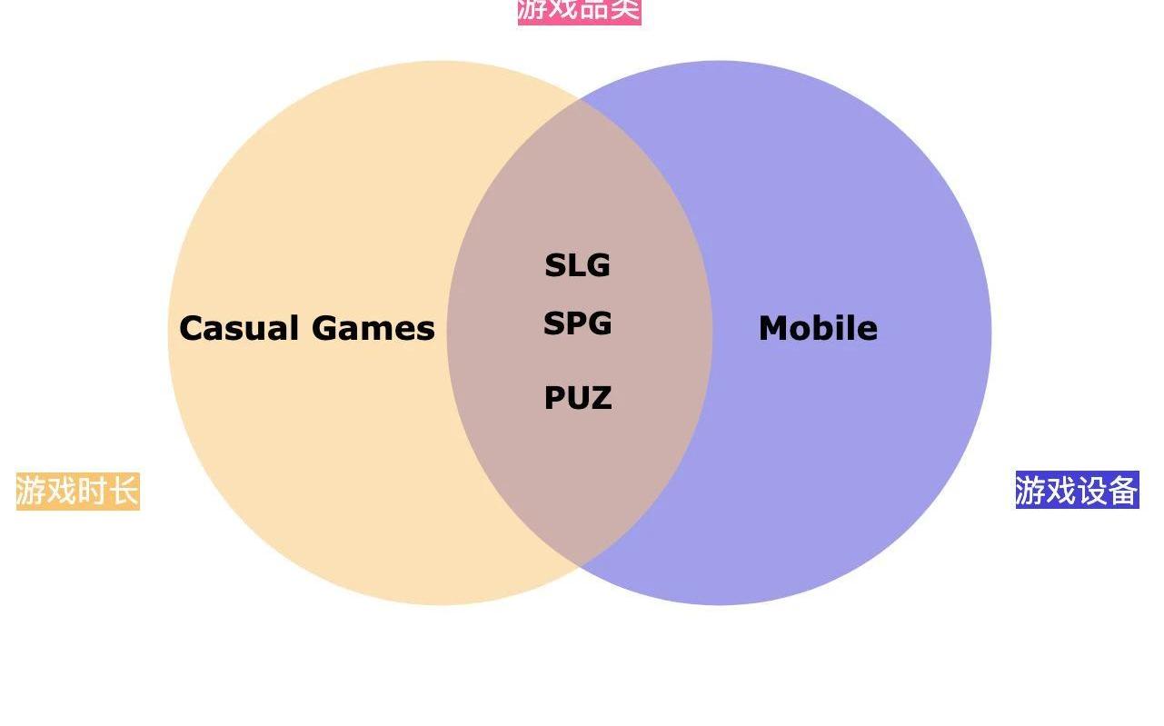 我們用韋恩圖對上面的游戲分類進行了交叉歸類,并將對它們之間的重疊部分進行用戶畫像分析。CasualGames+Mobile:玩家既不消費也不賺錢,通常利用碎片化時間玩游戲