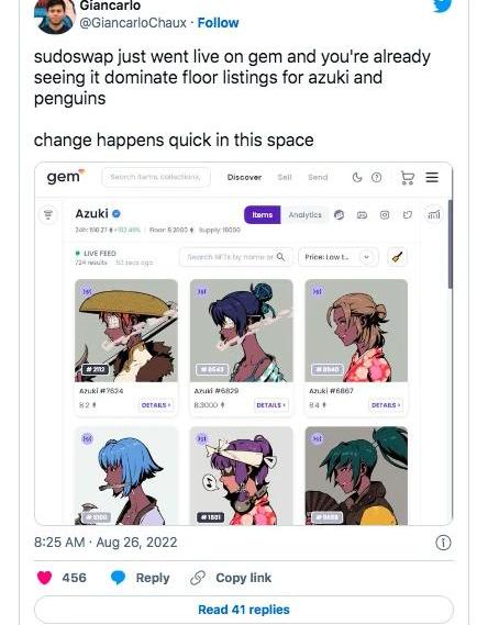 我自己的理解,這里有2個原因,X2Y2這里只說了0.5個,其他1.5個不方便直接講出來哈哈主流的聚合器打算在不久的將來提供類似的功能,這句話只說了一半。這里的「主流的聚合器」應該就是指GEM.就在同一天,GEM集成了sudoswap,熱門項目地板價全部被sudoswap占領,這會大大削弱x2y2競爭力。x2y2就是GEM起家的,必須要以某種方式跟進。有趣的是,GEM集成了sudoswap我并沒有在這2個官方推特賬號下看到,猜測應該是低調測試用戶反應目前熊市,用戶和項目方都在流失,市場龍頭老大opensea交易量也很慘淡,也是第二梯隊進攻的好機會。x2y2用這種方式可以競爭用戶,獲得更大的市場份額。而且這個功能本身也是一個容易傳播的話題點,所以x2y2官方發了推文公告。