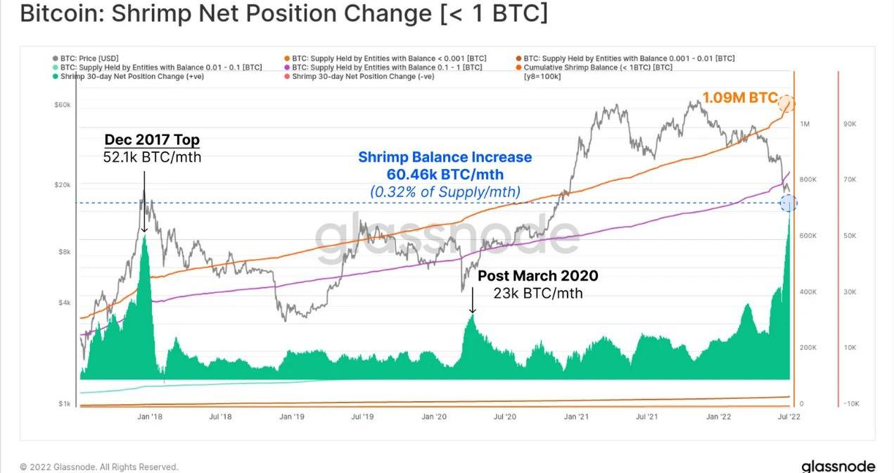 目前市場抄底的主要群體是散戶。22年6月,超過1000BTC的巨鯨增持14萬個,已積累870萬個,占流通量46%。超過1BTC的地址增加了2.5萬個至87萬個。1-100BTC的地址大幅增長創新高。