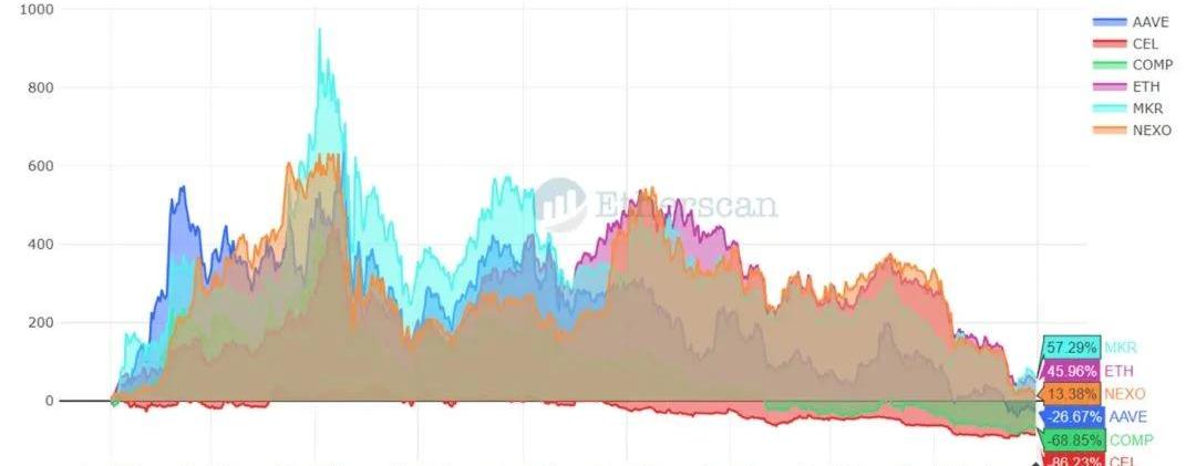 在借貸方面,MKR是一個例外,回報率高于ETH。而其他項目就沒有這么幸運,CEL也面臨著與VGX同樣糟糕的Luna問題。