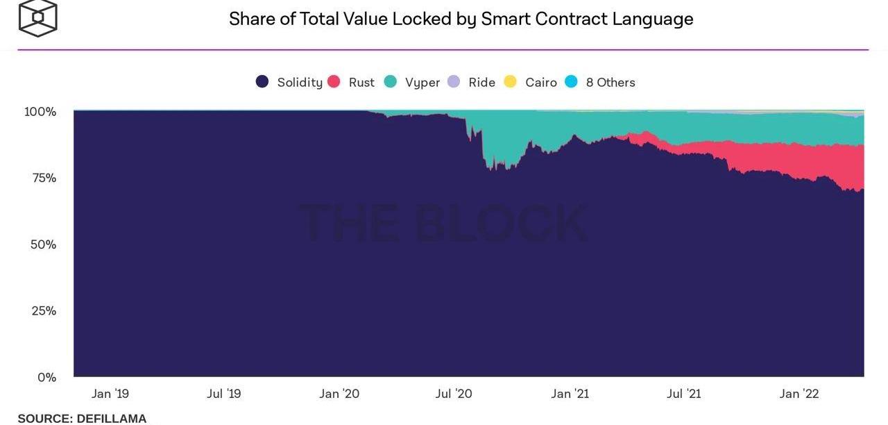 Solidity和以太坊虛擬機是區塊鏈的事實標準。以太坊是第一個允許鏈上智能合約執行的區塊鏈,為此,他們發布了Solidity,一種與以太坊虛擬機兼容的編碼語言。幾乎所有成功的去中心化應用程序都使用了Solidity和以太坊虛擬機來執行智能合約。
