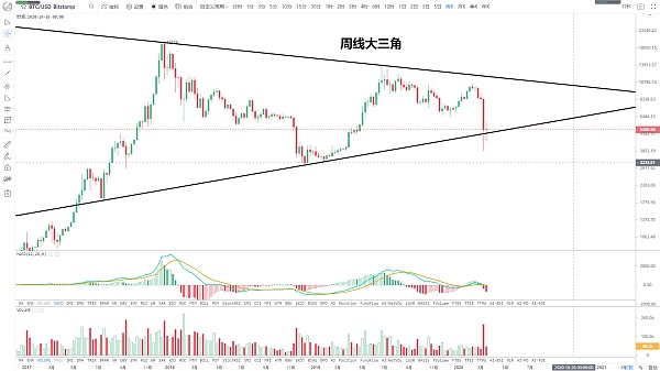 周線上,可以發現,整體仍位于2017年至2020年的長達三年多的大三角區間內來回震蕩,上邊線為17年牛市頂點與19年小牛頂點連線的年線壓制線,下邊線為17年周線突破回踩低點與18年熊市兩次探底低點連線的年線趨勢支撐線,價格處于兩線構筑的大三角末端持續震蕩,前段時間的強力下砸,幣價在三角下邊線形成抵抗支撐,并出現天量下影線,并促成近期大盤反彈,目前該重要防線比較關鍵,若有效跌破后面大概率將再度形成新一輪探底,所以后面該長期上升趨勢線能否守住仍是關鍵點。