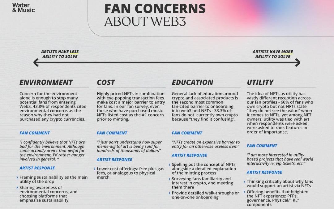 基于這些圖表的信息,我們無法判斷項目受眾中加密原住民的比例能否作為衡量正向情緒占比的指標,兩者間是否存在正相關性還有待進一步研究。也就是說,我們通過這項初步分析能夠得出的唯一結論是:每個藝術家的粉絲群體都具備高度個性化的屬性。同時,我們認為如果要建立一個全面客觀的粉絲情緒模型,則有必要納入一些相關的受眾數據,比如,基本信息、興趣愛好和核心關注點。事實證明,藝術家們很難通過Twitter平臺消除粉絲對NFT的疑慮,以扭轉粉絲情緒走勢,尤其是有關環境問題和金錢成本的疑慮。整體而言,這可能是因為Twitter平臺并不適合用于深度探討這些復雜的話題。Twitter數據無法完整地反映粉絲對音樂NFT的情緒感受。正如本文前言部分所述,藝術家們很可能因為擔心在Twitter上收到負面評價,而不敢嘗試NFT技術。然而,負面情緒并不一定意味著NFT項目的銷售額低迷。以CharliXCX在Foundation上發行的NFT項目為例,雖然遭到了粉絲的集體反感,但其總售價接近20ETH。同樣地,即便Twitter上的互動以正向情緒為主,也不一定代表NFT項目成功達成了吸引長期粉絲入駐、完成社區建設的目標。此外,對「成功」的定義也不一而同。一個新興藝術家的「成功」標準和一個知名藝術家的「成功」標準可能相差甚遠,特別是在社媒參與度方面。最終,影響粉絲情緒的主要因素還是落回到以下兩點:第一,藝術家與粉絲群體之間的關系是否足夠牢固,這是音樂行業Web3項目的核心要點;第二,在主流敘事背景下,粉絲們對NFT作品的接受度。另外,我們可能需要留意那些不受我們掌控的外部因素,但我們需要優先考量的,依舊是可控范圍內的杠桿,并將這些作為發行NFT項目時的主要聚焦點。