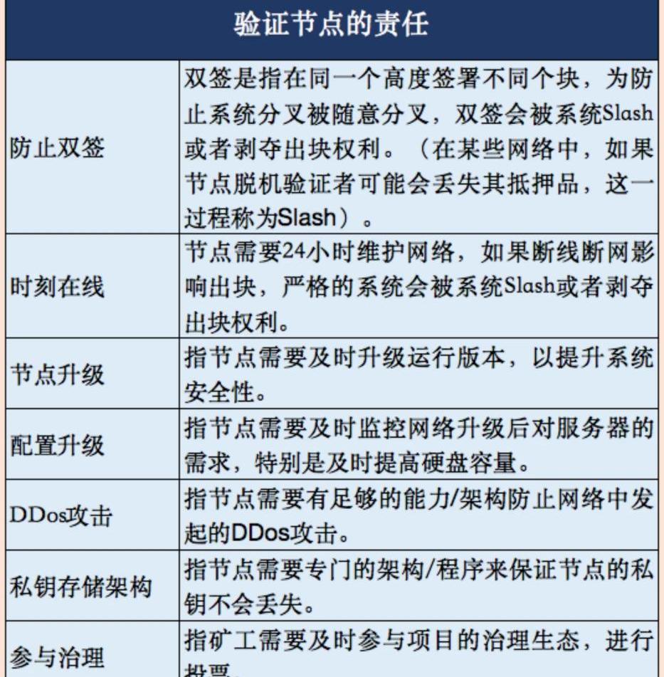 此外,想要成為驗證節點需要按系統要求穩定安全的完成出塊和驗證,這就需要嚴謹履行下圖里羅列的責任,比如及時升級、防止雙簽,并保證24h在線全連接等。