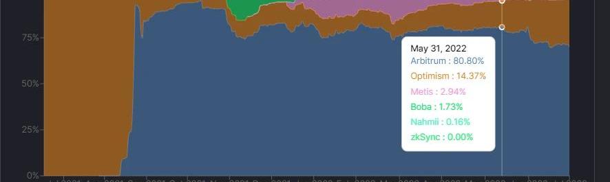 數據來源:https://defillama.com/chains/Rollup但Optimism在5.31公布代幣計劃,6.1執行空投之前的TVL占比僅有14.37%。
