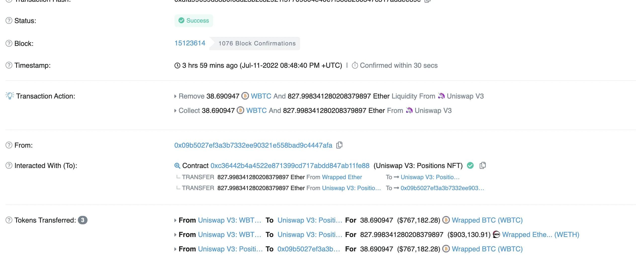 XRP/HKD-3.46%今早,CZ發推提醒:我們團隊在ETH上的UniswapV3上發現了一個潛在漏洞;到目前為止,黑客已經竊取了4295個ETH,他們正在通過TornadoCash洗錢,團隊希望與Uniswap取得聯系。經查詢CZ提示中的智能合約地址發現:確實有大量ETH被從UniswapV3上轉出,但似乎和普通的LP提款交易并無兩樣。