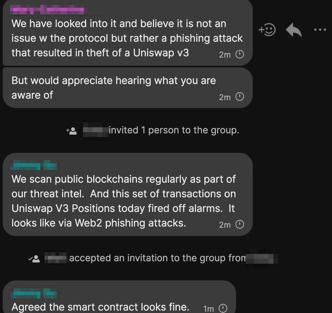 CZ推文發布不久后,一名推特網友@samczsun表示,這不是UniswapV3漏洞利用,而是一次成功的網絡釣魚活動。就在大家對此事展開熱烈討論時,CZ再次發推,曬出與UniswapV3創始人的談話截圖,表示這確實是一次網絡釣魚攻擊,因此導致批準了惡意交易的用戶的一些LPNFT被非法獲取,但這與UniswapV3協議無關,協議是安全的。最后CZ表示抱歉預警,希望大家保護自己免受網絡釣魚,不要點擊惡意鏈接。
