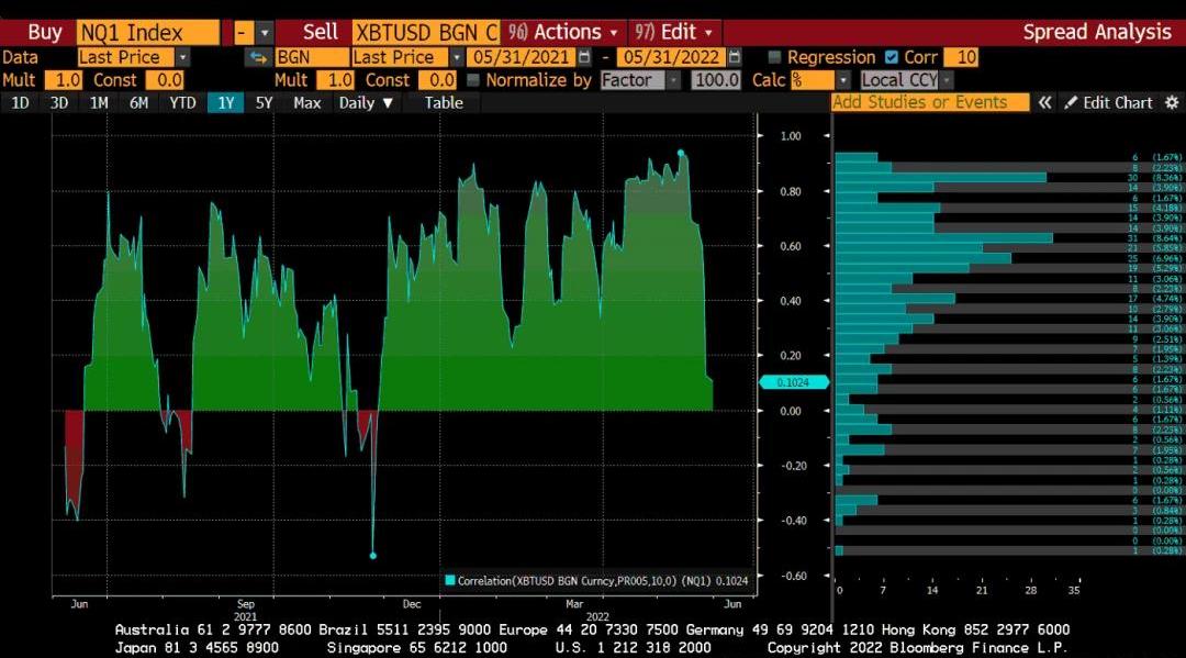 鑒于加密貨幣是全球最后一個自由市場,并將更快地納入恢復風險的行列,我們有理由認為最近TerraUSD和LUNA的瀑布能砸出市場的底部。我想把兩個理論聯系起來。1.從收費調整后的業績來看,大多數科技風險投資公司都是對整體市場而言昂貴的貝塔系數的工具。因此,由于通貨膨脹壓垮了像Netflix這樣的風向標,因為用戶選擇吃而不是為觀看更多平庸的Netflix原創作品的特權付費,而世界上最成功的一些科技公司,如Facebook的用戶增長持平甚至為負,一般融資和IPO環境在2022年第一季度迅速惡化。再加上不斷上升的名義利率,你可以想象硅谷、北京中關村和梅菲爾的那些身穿巴塔哥尼亞、戴著卡其的兄弟們的痛苦。2.下面的理論來自于我認識的最聰明的加密貨幣交易員之一,我沒有做工作來驗證他的理論,但從邏輯上講,這是有道理的。他推測,刺破TerraUSD泡沫的事件源于VC的場外交易,他們需要以最小的市場影響來兌現其LUNA頭寸。由于區塊鏈的公開性,早期VC如果賣出大量的LUNA頭寸將很容易被發現。該協議允許LUNA的持有者以1美元的LUNA換取1個UST,以當前LUNA/UST的市場價格。該LUNA將被燒毀,并創造等量的UST,對更廣泛的LUNA價值沒有任何市場影響。利用場外交易,風險投資公司將大量的UST換成了其他的穩定幣,如USDT,USDC,甚至是美元法幣,這樣不會影響到市場。最終的結果是UST的供應量大幅增加,這最終影響了其價格的脫錨。這些流動性有將近50億美元。TerraUSD崩潰的開始是在掛鉤的曲線略微破裂時發生的。這是因為相對于USDT和USDC等其他穩定的貨幣,UST的供應量太大。一旦掛鉤開始輕微斷裂,并且對快速恢復的信心減弱,算法穩定幣設計的負凸性就會接管并產生不可阻擋的下降力量。把這兩個事件放在一起,通貨膨脹驅動的風險投資資產負債表收縮和Luna泡沫破裂,我的理論是,更廣泛的風險厭惡環境促使他們在同一時間兌現他們成功的LUNA投資。全球風險厭惡運動是美聯儲制造的。因此,TerraUSD的崩潰是全球央行收緊流動性的一個間接結果。因此,我相信這一事件帶來了痛苦,而這些痛苦無論如何都會在幾個月后隨著美聯儲和其他國家繼續收緊流動性條件而發生。鄭重聲明,我并不是要把TerraUSD的崩潰歸咎于美聯儲。它的崩潰是注定的,任何閱讀過白皮書或研究過算法穩定幣的人都可以理解。我的觀點是,美聯儲為最終會發生的事情提供了催化劑。值得慶幸的是,由于加密貨幣沒有政府救助,我們很快就找到了真正的清算價格,現在可以痊愈,然后繼續向我們的目標前進。我堅信,加密貨幣引領更廣泛的市場。數據支持這一點,因為在最近的加密貨幣市場崩潰期間,比特幣/以太幣和納斯達克100指數之間的相關性破裂。下面,讓我們重新審視一下相關性圖表,看看它們都是如何急劇轉低的。按照先后順序,以下是比特幣與前月納斯達克100指數期貨合約之間的10天、30天和90天滾動相關性圖表。