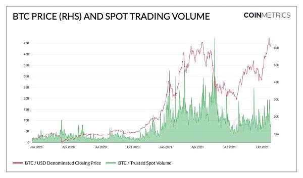 與今年早些時候BTC價格的上漲不同,近期的歷史新高尚未導致每日現貨交易量創下新紀錄。