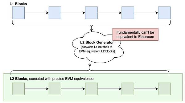 在實踐中,我們確實必須對以太坊的 L2 進行一些更改:特別是如何生成區塊。在 L1 上,節點使用工作量證明(PoW)共識機制來確定區塊;在 L2 上,通過發送分批交易到「父鏈」(L1 以太坊)實現批量交易。如果 L2 使用自己的 PoW 共識,它將是 L1! 所以「等效性」在這個層面上基本上是荒謬的。