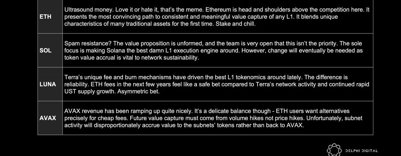 L1近六個月價格表現如果問銀行家,蘋果公司是如何估值的?你得到的答案或多或少都與現金流折現、市盈率等有關。但如果要問加密貨幣專業人士,他們如何估值ETH?事實上,問他們為什么代幣有價值?加密貨幣是真的貨幣嗎?還是商品、股票或者債券?你會得到不同的答案。那么,到底如何對代幣進行估值?一些企業估值工具可能對你最喜愛的DEX相當有效。但是如果代幣包括治理和財務控制的權益,估值就會變得困難。看看「CurveWars」,就知道治理的價值可能有多大。優先考慮早期創業公司的增長指標,將DCF應用于更成熟的現金流協議,這聽起來更加合理。當我們引入原生L1代幣時,情況會變得撲朔迷離。治理權?不太可能。為持有者帶來收入?不一定。具體而言,PoW網絡中礦工拿走了區塊獎勵、交易費和MEV的利潤;比特幣和以太坊都完全采用鏈下治理。BTC和ETH長期以來一直主導加密市場,這些事情很重要,但它顯示了一個更大的圖景。以Solana為例,代幣持有者通過質押直接獲取網絡價值。用Anatoly的話說,Solana是一個信息總線。除了你的質押讓你有權利獲得MEV之外,SOL只是「防止信息總線中的垃圾郵件的東西,僅此而已」,在此之外的任何價值都不得而知。那么,SOL的價值是否應該等于其未來預期MEV的凈現值?即使在最積極的預測中,SOL的市值也會被削減。為了簡單起見,本報告在論述時主要采用ETH和SOL,它們分別代表:ETH-試圖獲取可持續價值的公鏈,即持續推升代幣價值對網絡發展至關重要的一類公鏈;SOL-試圖最小化從用戶那里提取費用和價值的公鏈,這類公鏈的發展狀況與代幣價格的相關性較低。之所以以SOL為例,是因為Anatoly已經對其做出了詳盡且清晰的闡述,這是展開一場健康的辯論的大前提。盡管我不同意他的許多論點,但我會尊重論證這個問題的過程。為什么代幣會有價值?
