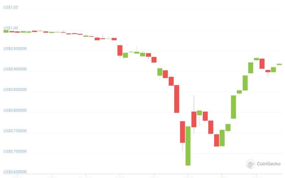 XRP/HKD-1.75%算法穩定幣龍頭TerraUSD正處于災難性的混亂之中。Coingecko數據顯示,隨著近日加密貨幣市場整體下挫,BTC一度跌破30000美元關口,UST脫離錨點的幅度越來越大,于北京時間5月10日9時左右探底至0.66美元。截至發稿時,UST已反彈至0.9美元附近。