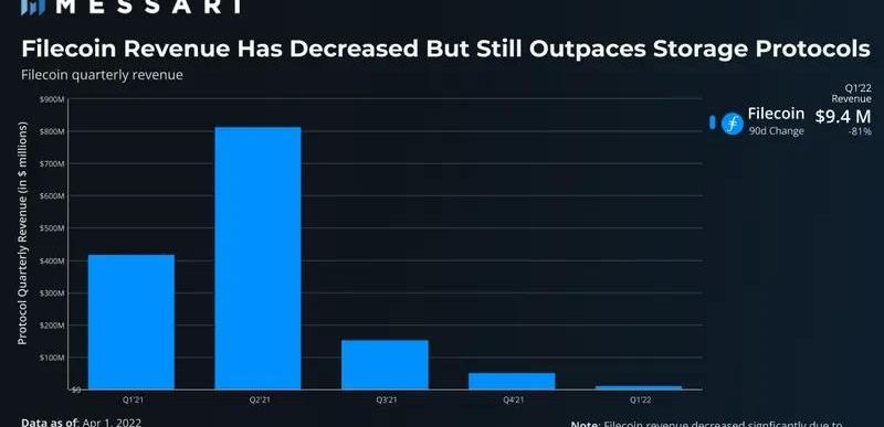 在文件存儲協議領域中,Filecoin的收入仍獨樹一幟,在2022年第一季度的收入超過900萬美元。有趣的是,隨著基本費用下降,Filecoin的收入逐季大幅下降。