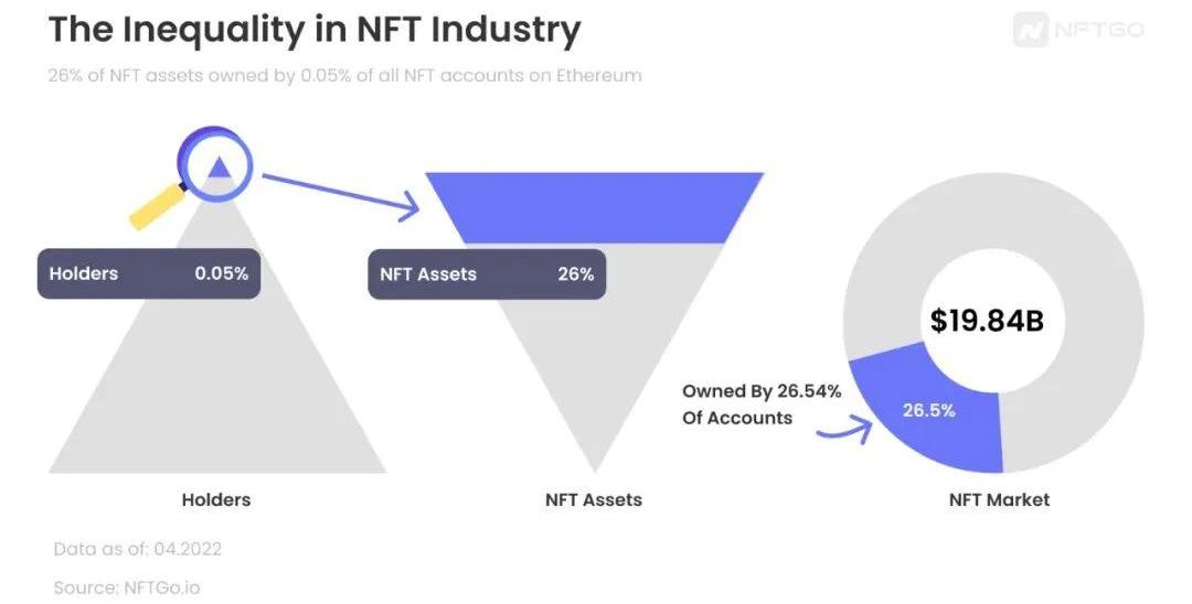 巨鯨存在所帶來的是雙刃效應,主要從買入賣出兩個方面帶動市場。一是巨鯨買入。一些巨鯨會堅信好項目的價值,在一些項目或市場價值回調時,他們會為其所信任的項目進行底部地板的購入護盤。此外,項目的價格飆升往往也和巨鯨大量買入相關。但需要注意的是,有些巨鯨通過大量掃地板抬高某個Collection的價格。這時,人們開始FOMO,在市場情緒高點入場,這時巨鯨或會出售他們的一些NFT來獲利。一是巨鯨賣出。有一些巨鯨通過低于市場價ListingNFT接連出售,從而導致地板價波動,隨后人們可能開始恐慌,以更便宜的價格出售他們的NFT。若有利好信息,巨鯨或會再次低位買入。此外,巨鯨也會根據一些小道消息提前進行布局。保持對巨鯨的關注十分重要。NFT持有者分布