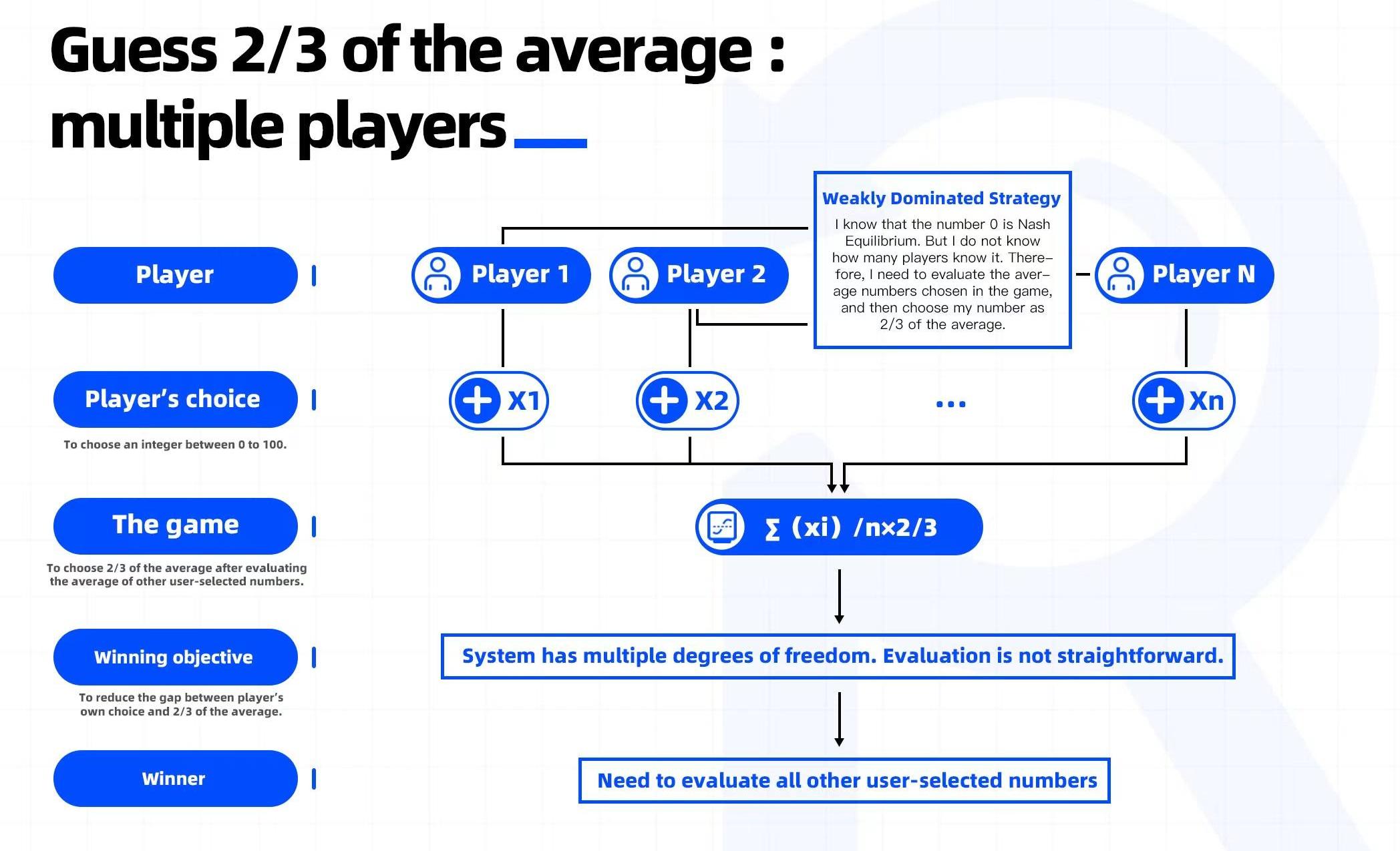 簡化為最本質的形式,兩人游戲實際上是“誰選擇較小的數字獲勝”的場景。由于游戲的自由度較低,玩家只需選擇比其他玩家更小的數字即可贏得游戲。因此,對于所有玩家來說,“嚴格優勢策略”是選擇0。1.2多人“平均數2/3”博弈當游戲有兩個以上的玩家時,我們會面臨更復雜的情況,因為新玩家的存在會迫使所有玩家重新思考其他玩家的行為動機。獲勝策略從“嚴格優勢策略”轉變為“弱支配策略”。