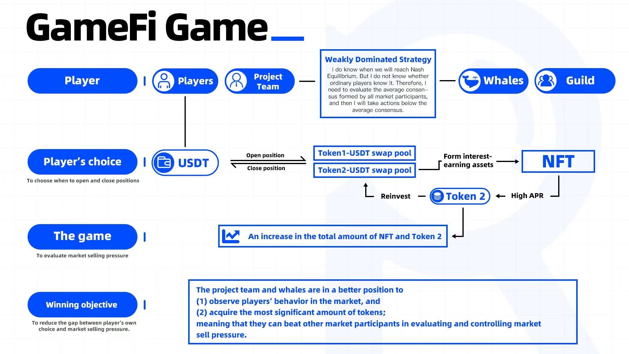 在DeFi和GameFi的金融屬性背后,參與者通過評估其他參與者的平均行動共識來調整博弈策略進行游戲。為什么不是單純的決策,而是動態的博弈?因為玩家A的決定會影響玩家B的決定,進而影響玩家A自己的決定。因此,玩家將體驗到游戲的復雜性,因為他們的決定會同時發生在所有玩家身上。游戲的發展將是多維的并且實時發生,特別是在具有足夠深度和流動性的市場中。
