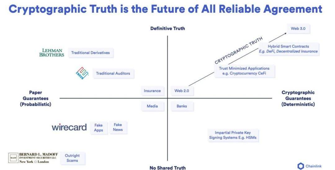 上文中我們重點說到了區塊鏈如何結合加密技術和博弈論,就內部交易的有效性誠實地持續達成共識。然而,區塊鏈之外的事件如何得到可靠驗證呢?答案就是:使用Chainlink。Chainlink是去中心化的預言機網絡,其目的是生成關于外部數據和鏈下計算的事實。也就是說,Chainlink圍繞不具有確定性的現實世界生成事實。“確定性”是一種計算特性,具體指“特定的輸入永遠都會產生特定的輸出”,即:代碼會嚴格按照約定執行。去中心化的區塊鏈具有確定性,因為它采用了信任最小化的技術,消除了任何可能阻止內部交易提交、執行和驗證的變量,或將其發生概率降至統計學上接近零的水平。非確定性的環境存在一個挑戰,那就是事實可能是主觀的,難以獲得,或需要耗費巨大成本去驗證。比如,比特幣的價格是什么?答案是:由于每個交易平臺上比特幣的價格都不一樣,而且價格一直處于變化狀態,因此不存在客觀統一的比特幣價格。另外,是否所有用戶都能接受獲得事實的成本以及創建事實的具體方式呢?比如,一個網絡中包含許多高性能的物聯網設備,其輸出的天氣數據遠比普通的單一傳感器更準確,但這個網絡的安裝和運行成本也相對更高。這個例子說明了一個問題,那就是不同人和不同企業可能對外部事實的生成方式及其成本的接受程度不一樣。由于區塊鏈只負責維持所有用戶和應用之間的單一事實來源,因此Chainlink就變得至關重要,因為Chainlink能夠讓用戶創建自己的“權威事實”,即:預定義事實創建的方式,并且所有相關方都認可這個方式是權威的。另外,生成權威事實的預言機機制也可以得到驗證,使用區塊鏈的加密保障和確定性的計算來執行預言機條款。