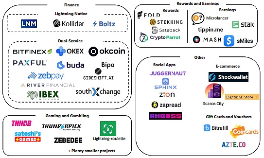 另一類包括為其商品或服務接受閃電支付或在其服務中使用閃電支付的企業,例如,通過閃電網絡進行信用卡支付的satsback。我們將這一廣泛的類別稱為商業,然后將其劃分為兩個概念上不同的子類別。第一類閃電商務公司是一家接受閃電支付作為交換媒介的公司。通常,它將通過在閃電網絡上接受客戶付款來實現。第2類閃電商業公司也接受閃電支付,但除此之外,這些公司還加入了閃電網絡的一些屬性,以顯著改善其服務或實現其商業模式。