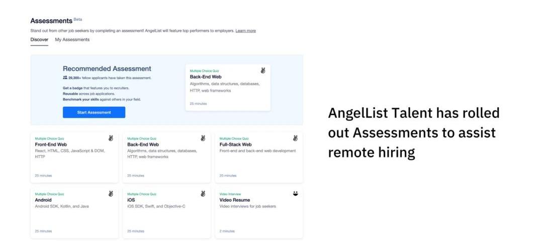 AngelListVenture和AngelListTalent使用相同的品牌,但是兩家企業,由不同的領導者掌舵。Talent最開始是一個郵件列表。AngelList最初的想法是,平臺上只有大約3-5%的公司在籌集資金,企業如何為其他95%的企業提供服務?團隊發現,服務吸引了希望進入科技領域的新用戶。于是為公司和求職者構建了工具。產品很快就發布了,AngelList沒有試圖立即賺錢,而是對Talent保持耐心,維持著驚人的增長率。團隊確信它非常有價值,并且有一天會產生收入、成為獨立的公司,沒有必要急于求成。雖然Talent最初服務于早期項目,但隨著其工具的成熟,它也逐漸可以服務大型公司。如今,亞馬遜和Stripe等公司都在使用該平臺。Talent團隊具備很好的盈利能力,該產品的收入包括SaaS費用和安置獎勵,現在擁有超過800萬用戶。三個核心產品構成人才平臺:招募Recruit策劃Curated遠程RemoteRecruit允許招聘公司列出工作、篩選申請人、向候選人發送消息并管理面試。企業可以通過每月250美元的高級版平臺付費來推廣他們的工作并提高其曝光度。“RecruitPro”產品解鎖了更多候選人篩選功能,并支持立刻約談。尋找更加高端服務的企業則需要Curated。公司不是尋找候選人,而是將任務外包給AngelList的團隊。有專門的代表對申請人進行審查,篩選出他們認為符合雇用者需求的人。該服務僅限于工程師、產品經理、數據科學家、設計師和銷售代表。每月收費250美元,成功費用為候選人基本工資的20%,與其他招聘公司一致。最近,Talent推出了專注于在美國境外招聘的CuratedGlobal,還處于搶先體驗階段,廣告價格為6,000美元/次,一旦招聘成功,需要支付12,000美元。客戶每月可獲得2,000美元的額外支持。Talent的最新產品是雇傭全球員工的Remote。該產品有幾個漂亮的功能,包括按時區篩選、愿意在美國工作的時間以及在各種測試中的表現。這些評估由平臺上的候選人完成,重點關注工程技能,包括前端、后端、Android和iOS開發能力。候選人還可以錄制兩分鐘的視頻或音頻“簡歷”來詳細說明他們的技能。