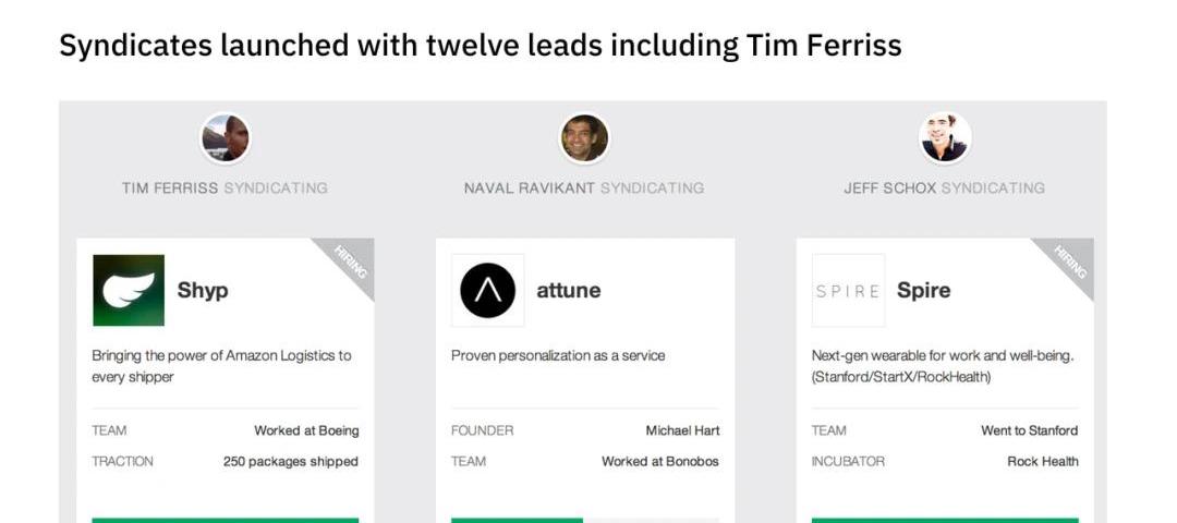 AngelListInvest是公司在投資業務上的第一次嘗試,它將投資人的資金門檻從此前的2.5萬美元降到了1000美元。這一重大嘗試建立在著名的JOBS法案之上。截至2012年底,AngelList已經為10萬家公司和5000名經認證的投資者(accreditedinvestors)提供服務。但AngelList的增長不僅僅只取決于產品創新,還需要考慮法律和金融監管實踐。當年,AngelList開始對JOBS法案通過進行游說。注1:美國證券交易委員會將經認證投資者定義為:最近兩年中每年總收入超過20萬美元的個人,或與配偶或伴侶的共同收入在這些年中超過30萬美元,并有理由期待在本年度達到相同的收入水平。個人凈資產,或與配偶或伴侶的共同凈資產超過100萬美元的人,不包括該人的主要住所。注2:JumpstartOurBusinessStartupsAct簡稱JOBS法案,這部法案包含7個部分:I)對新興成長型公司重新開放美國資本市場,II)創業企業的資本籌集,III)眾籌,IV)小型企業集資,V)私人公司的靈活性與成長,VI)資本擴張,VII)法律修訂宣傳。JOBS法案第一部分在2012年10月生效。2013年9月,JOBS法案的第二部分通過,解除了80年以來非公開發行不得進行公眾宣傳的禁令。這一突破讓AngelList直接受益,成為了一個股權融資眾籌平臺。在美國證券交易委員會宣布JOBSTitleII正式生效的第二天,AngelList就發起了12個Syndicates,組織者包括TimFerriss和NavalRavikant。Syndicates的結構允許投資者協商分配到一家初創公司,然后接受共同投資者加入。注:Syndicate:一種投資工具,是為進行一項投資而創建的特殊目的載體(SPV),是一個專門為支持創業公司而設立的風險投資基金。允許投資者與相關且有信譽的投資者共同投資于市場上最好的初創公司。