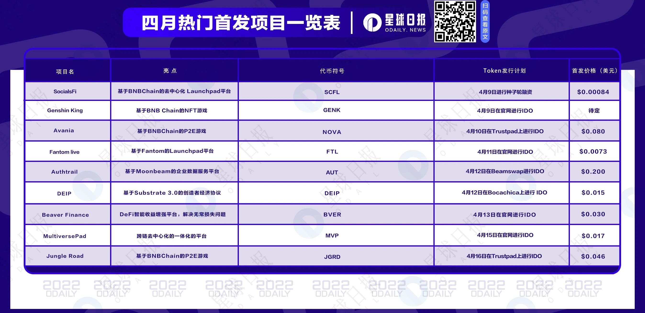 上周,我們盤點了4月第一期IDO首發項目名單。近期由于市場注意力轉移到了NFT領域,一些IDO項目白名單沒有填滿,有用戶上周便「撿漏」中了幾簽,收益率大約在200%左右。今天,我們再次整理了一份包含9個即將首發的項目名單,供讀者參考。從統計結果來看,新項目依然多在元宇宙、P2E領域,且以BNBChain生態為主。以下為9個首發熱門項目的簡介,enjoy~