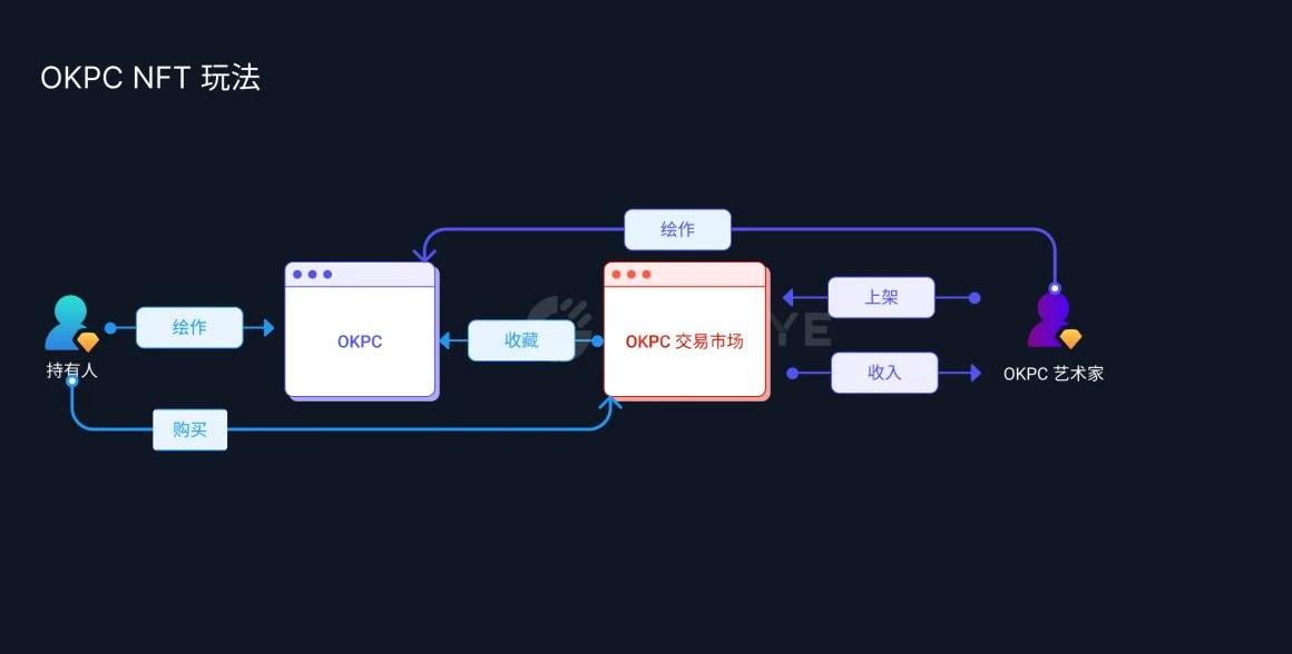 OKPCNFT玩法與靜態NFT不同的是,OKPC將創作權給予了持有者。OKPC的持有者可?致分為NFT持有人及OKPC藝術家。持有?可繪作和收藏像素畫,OKPC藝術家可在交易市場上架展覽、被收藏后可獲取收?。
