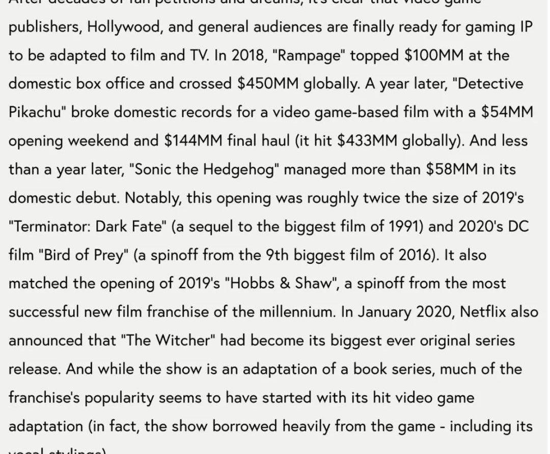 在傳統媒體中,大企業投資游戲和電影項目,但這些項目投入只占公司收入的很小部分。例如《偵探皮卡丘》在票房上取得了成功,但仍不及華納總收入的1%。