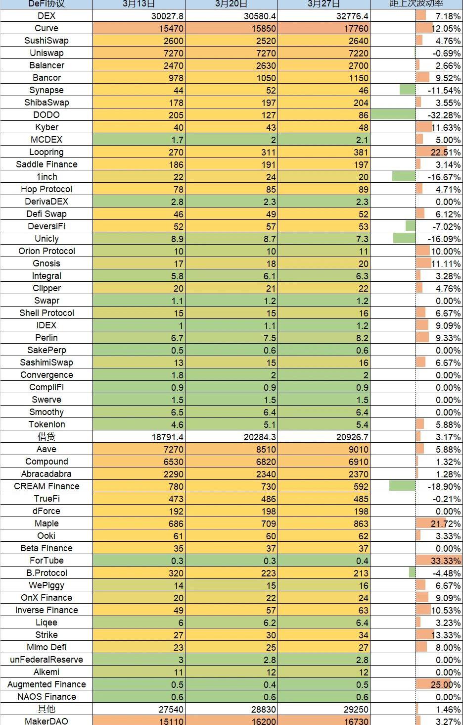 本周收益于ETH大幅上漲,ETH鏈占比大幅提升,從上周的54.84%上升至56.15%,占比上升1.31%,TerraTVL出現近兩個月以來第一次占比下降,下降0.52%,其余各鏈變化均較小。各鏈協議鎖倉量情況