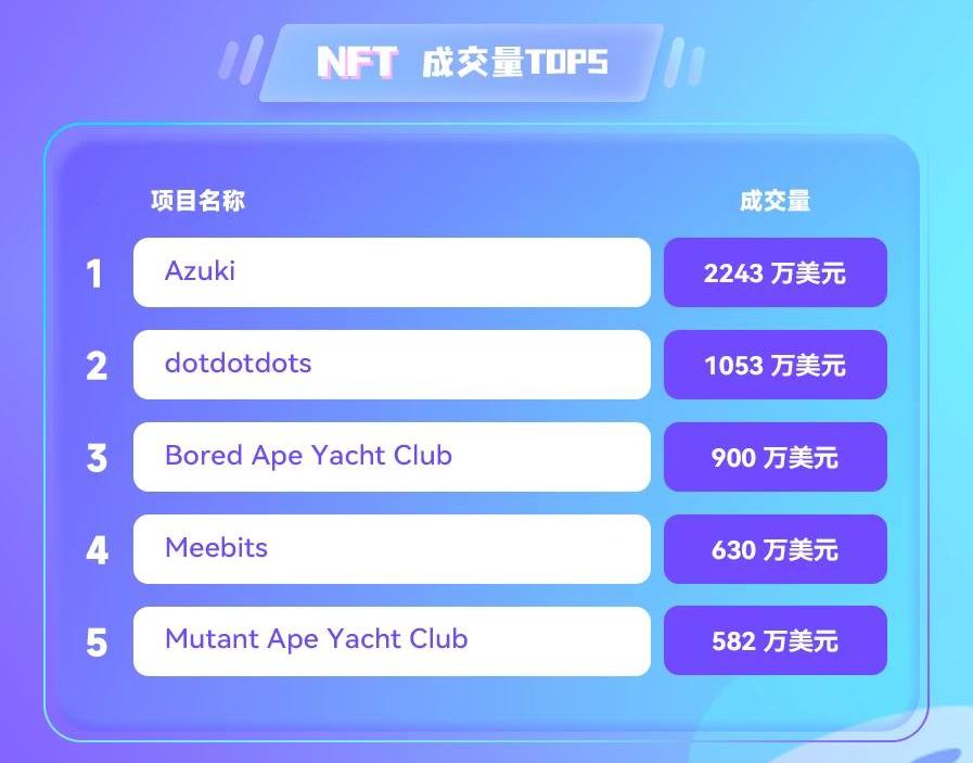按過去24小時成交量,排名前五的項目分別為Azuki、dotdotdots、BoredApeYachtClub、Meebits和MutantApeYachtClub。
