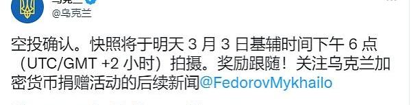 3月2日,烏克蘭通過官方推特表示,將向為其加密地址捐款的用戶進行空投。