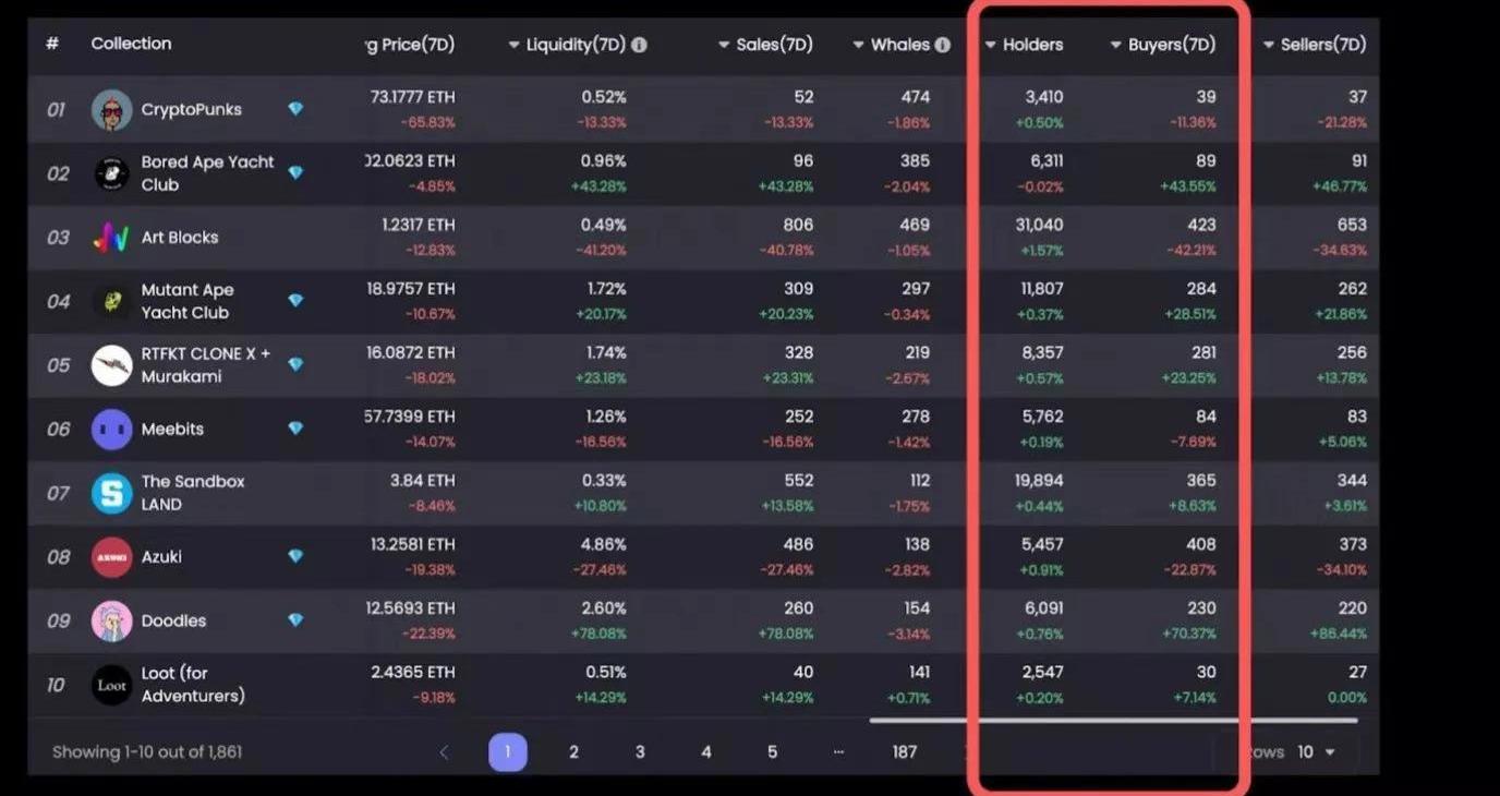 數據來源:NFTGo.io與資產通常具有1/1關系的加密市場不同,一些NFT項目的下跌為其他項目提供了受益空間。根據NFTGo的數據,可以看出BAYC賣家的資金流向,大量的BAYC持有者出貨,然后他們購買了其他藍籌NFT。由此可見,市場上一些大資金對新的藍籌NFT的市場前景持樂觀態度。其中最值得注意的是,上周Doodles的買家增加了70%,Doodles交易活動的大幅增加使其流動性飆升。危機致使下跌后,隨之而來的買盤使其地板價較快拉回,也反映了該社區類項目強大的共識基礎。上周,Doodles的流動性增幅最大,另一方面,賣家人數增長大于買家人數增長,幾乎對最終凈持有者數量沒有產生的影響。