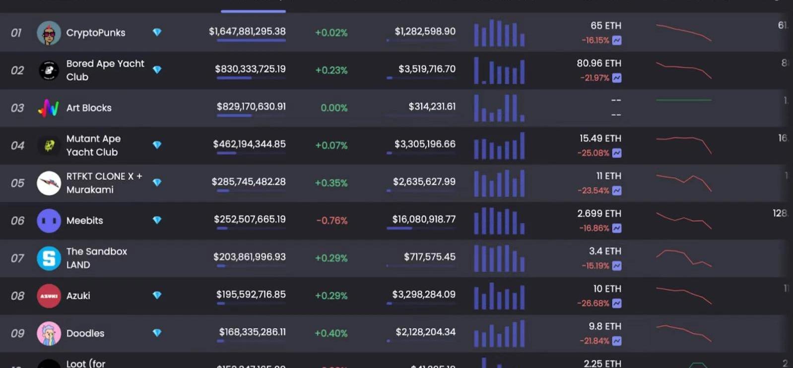 數據來源:coinmarketcap同樣的趨勢也出現在NFT市場中。在所有前10名的收藏品中,MAYC的跌幅最低,為2.83%,CryptoPunks的跌幅最高,超過16.29%。