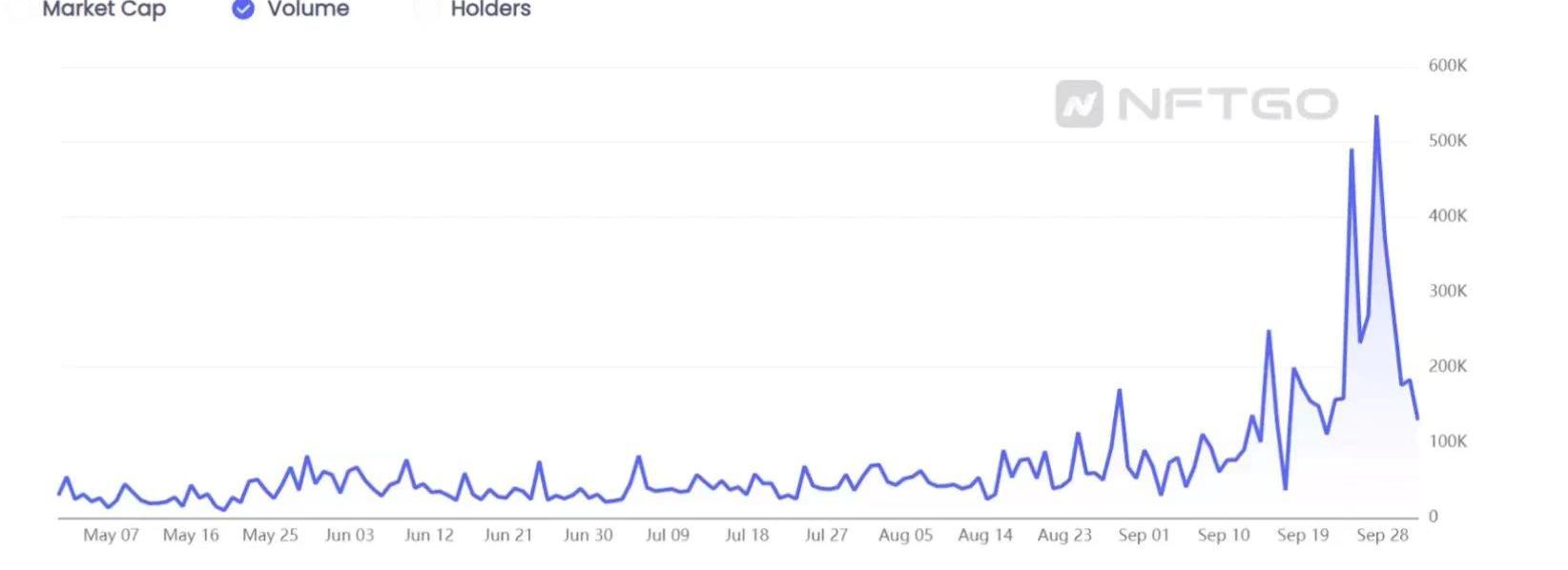 數據來源:NFTGo.io然而,若通過將觀測時間窗口擴大到30天,則NFT市值呈上升趨勢,上個月增幅為33.3%。