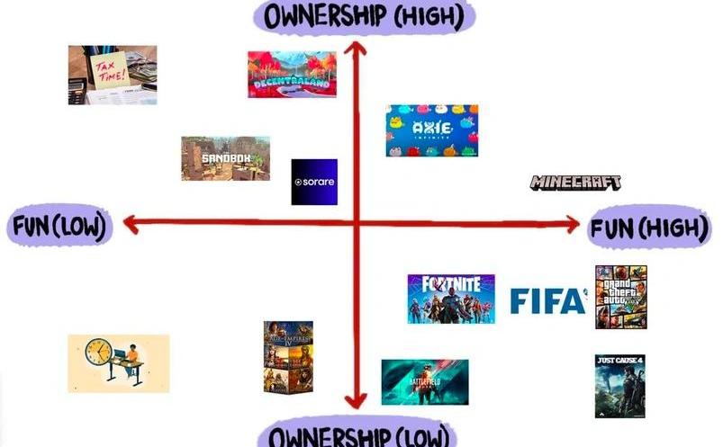 在功能上,Web3的游戲將基于區塊鏈的基礎設施與金融激勵相結合,從而為玩家在游戲中花費的時間提供經濟支持。這是使Web3游戲既令人上癮又令人厭惡的核心所在。一方面,游戲應該是有趣的。正如我之前所說,游戲是一種玩家逃避現實困難的方式。但是,自21世紀初以來,一直有游戲代理人通過玩游戲為工作換取金錢利益。RuneScape、Farmville或GTA5,它們都有一個繁榮的代練市場,在這里,有技術或有時間的代練會得到其他希望在游戲中更快發展的玩家的補償。對于大多數面向網絡的游戲來說,它們所面臨的巨大挑戰是如何在超額的財務方面和游戲的樂趣方面找到一個微妙的平衡。現代生活是建立在對功利社會的信念之上,如果我們被告知只有那些有錢的人才能贏,那么大多數一開始就不會選擇玩這款游戲。同樣的道理也適用于游戲設計:如果它們被設計成只有愿意付錢的用戶才能獲勝,那么用戶群就會明顯減少。反過來,對于那些付得起錢的人來說,這也會使整個游戲體驗變差,因為沒有人喜歡獨自玩。撇開哲學不談,游戲還有一個方面使其獨特。目前形式的游戲是零和的:玩家必須一次專注于一個單一的游戲,在這個游戲中,他們被迫在有限的參數上進行優化。用戶必須不斷地在創造財富或享受樂趣之間進行權衡。下面的象限在一定程度上解釋了這一點。當今游戲架構的局限性意味著最激烈的圖形游戲不能為用戶一直移動資產而進行優化。想想像《正義之戰》或《GTA5》這樣的熱門游戲,它們被優化為具有視覺吸引力和樂趣,而不是為了自定義或資產所有權。另一方面,Axie允許資產所有權,但它的可定制性卻非常有限。這里的異類是Minecraft,個人可以建立自己的服務器,有自己的變量,并選擇他的運行方式。在表格低所有權和低趣味性的極端,對應著稅收和苦力工作。這兩者都屬于我們自己所處的默認游戲:現實生活中。