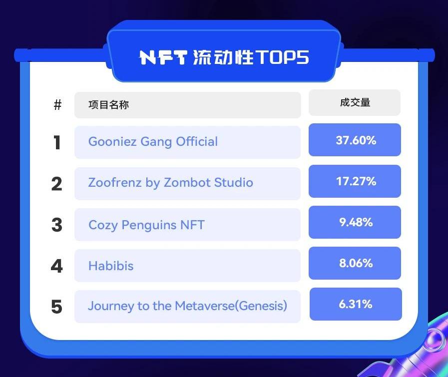 按過去24小時流動性指標,排名前五的項目分別為GooniezGangOfficial、ZoofrenzbyZombotStudio、CozyPenguinsNFT、Habibis和JourneytotheMetaverse(Genesis)。