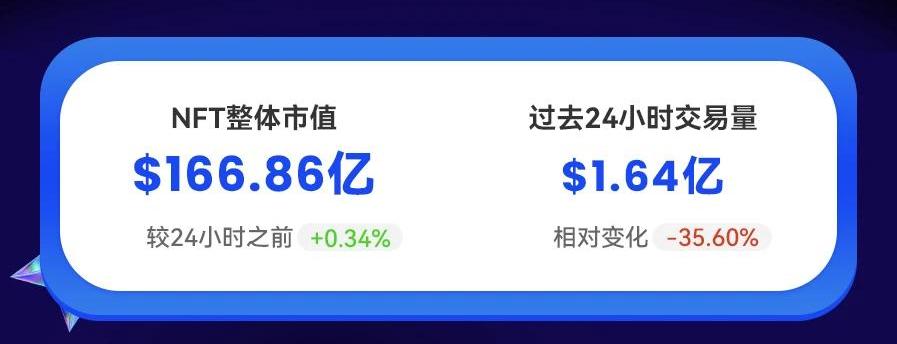 截至2月18日15時,NFT整體市值166.86億美元,較24小時前增長0.34%;過去24小時內總交易量約1.64億美元,日環比下降35.60%。