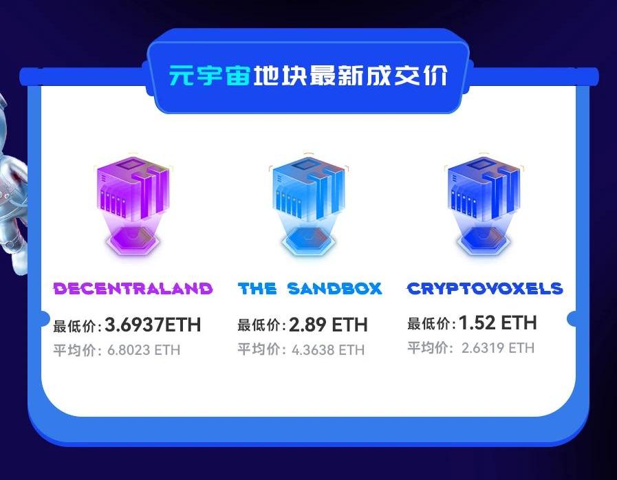 元宇宙平臺中,過去24小時內,Decentraland上的地塊最低成交價為3.6937ETH、平均成交價為6.8023ETH;TheSandbox上的地塊最低成交價為2.89ETH、平均成交價為4.3638ETH;Cryptovoxels上的地塊最低成交價為1.52ETH、平均成交價為2.6319ETH。