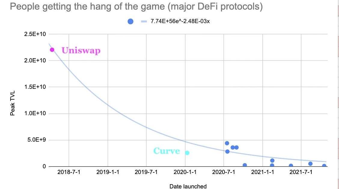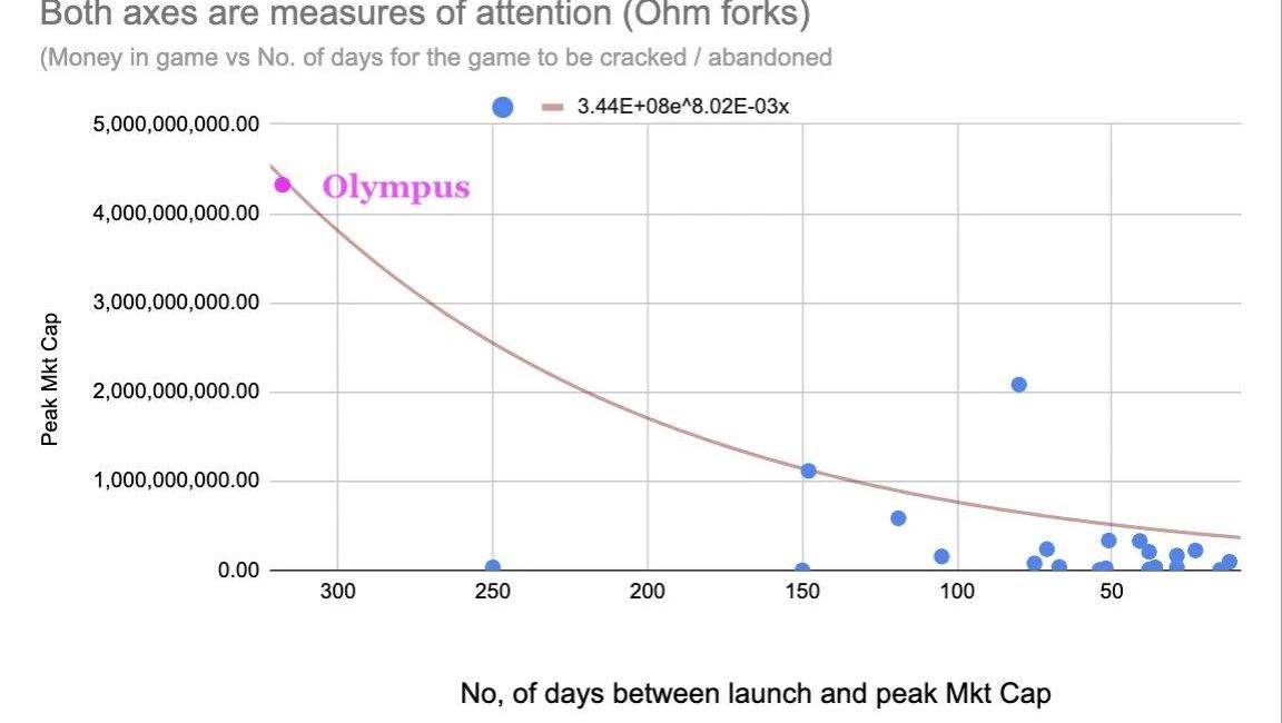 我們還不知道Olympus在未來幾個月的時間里會如何發展,我們也不知道它是否能在未來幾年生存下去。但在它引發大量的興趣和創新之后,我們也許能夠從中得出一些教訓。從一開始接觸DeFi時,我就注意到了它與游戲有非常多的相似之處。所有的DeFi項目其實就是GameFi。既然是游戲那它就自然會面臨客損,而且它們都有自己的半衰期。我自己從來都不是一個狂熱的游戲玩家,但我仍然注意到了DeFi和游戲的無數相似之處:活動的同構性,玩家之間競爭的性質,重疊的社區,相同的分析技能組。在加密貨幣風險投資公司和項目的面試中,都不可避免的會涉及游戲相關的問題——擼啊擼、魔獸、文明6、求生之路、堡壘之夜、國際象棋、圍棋、撲克、橋牌。因此,看看為什么一些游戲會被淘汰可以非常好的預測一個DeFi項目的未來發展。事實上,DeFi新手可能還沒想明白的一點是,這些讓你在挖礦上收獲滿滿的協議其實并不是一項真正的投資。你所做的代幣交換并不是真正的交易。如果投資被理解為基于基本面分析的投資,那么我們看到的DeFi挖礦和跟風進場就不能被歸類為投資,而是投機和賭博。因此,這使得DeFi的每個協議都變成了一個賭桌,在那里有贏家就一定會有輸家,因為它是零和游戲。但是交易卻不一定是零和的,投資也不一定是零和的。一個新協議的出現就是一個新賭場的開幕,一個協議的創新就相當于發明了一款新游戲。你可能會抱怨DeFi不是真正的零和。是的,當資金通過各種聚合器被分批送到DeFi挖礦,這樣你就可以節省gas費用,靠你的LPtgt賺取費用等等。但說實話,當你無腦跟風進場的時候,你并不是這么想的。你害怕被人搶先拿走更多的利潤,你害怕別人會提早砸盤,你更關心的是代幣的價格而不是協議長期的愿景,這些聽上去都是廢話,因為你們的內心都渴望著利潤最大化。分叉是另一輪游戲的開始,另一把撲克,另一局國際象棋。游戲是可以被攻克的。已解游戲是指在假設雙方都完美發揮的情況下,其結果可以從任何方向進行正確預測的游戲。當且僅當任何棋手的最優策略都被發現時,一個游戲就可被稱作已解游戲。顯然,在歸納的層面上,可以被攻克的游戲是沒有樂趣的。井字棋就是一個已解游戲:兩個完全理性的玩家玩井字游戲,結果一定是平局。如果他們在上面賭錢,那么兩個人都不會贏,事實上,玩井字棋實際上會浪費他們的時間,所以對他們來說玩井字棋就會造成凈損失。因此,當有人邀請你玩井字游戲時,理性的做法是sayno。四子棋也是一個已解游戲。而且,它已經被數學證明是誰出先手誰會贏。如果玩家打算在這個游戲上下注,那么后手玩家就會一直輸錢。因此,如果有人提出讓你作為后手玩四子棋時,你同樣應該拒絕。雖然已解游戲在博弈論中有著嚴格的數學定義,但我們可以直觀地感覺到,隨著我們參與同一類型游戲的次數逐漸增多,我們在游戲中的表現也會越來越好,因此我們也會越來越接近游戲的最優策略。簡而言之,我們在游戲的過程中學習,進化博弈論捕捉到了這種直覺。有趣的是,進化博弈論的發明和提出是出于解釋達爾文進化論中利他行為的需要——這就是為什么Olympus試圖將策略meme化的原因,如果所有礦工都是理性的那這就是最優策略。唉,但人類是不理性的。考慮到人類并不理性,用最優策略的數學定義來描述玩家因為知道游戲規則而干脆停止游戲的最終狀態并不完全準確。Olympus分叉項目的死亡不是因為協議是可以被攻克的,而是因為礦工已經根據他們實際挖礦的方式找出了最優策略。如果我們把DeFi協議視為游戲,那么有我們理由認為,隨著更多分叉項目的出現,人們會玩得越來越好,游戲被攻克的速度也會越來越快。換句話說,一個游戲被攻克的時間會越來越短。我們可以在下面的圖表中看到這一點: