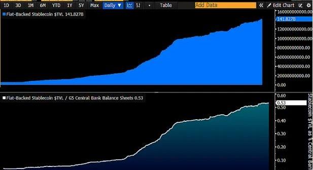 上圖:DeFi開發增長和價格走勢趨勢基本吻合加密美元正在扮演“DeFi黃金”的角色。隨著時間的推移,過去許多不相信DeFi的人發現,越來越多法定貨幣被“無情地”兌換成穩定幣。數據顯示,目前流通中由法定貨幣支持的穩定幣總額已經達到1410億美元,比2021年增長了四倍。這種增長的主要驅動力是人們希望在DeFi中尋求更高的收益回報,并在熊市中尋求風險對沖。