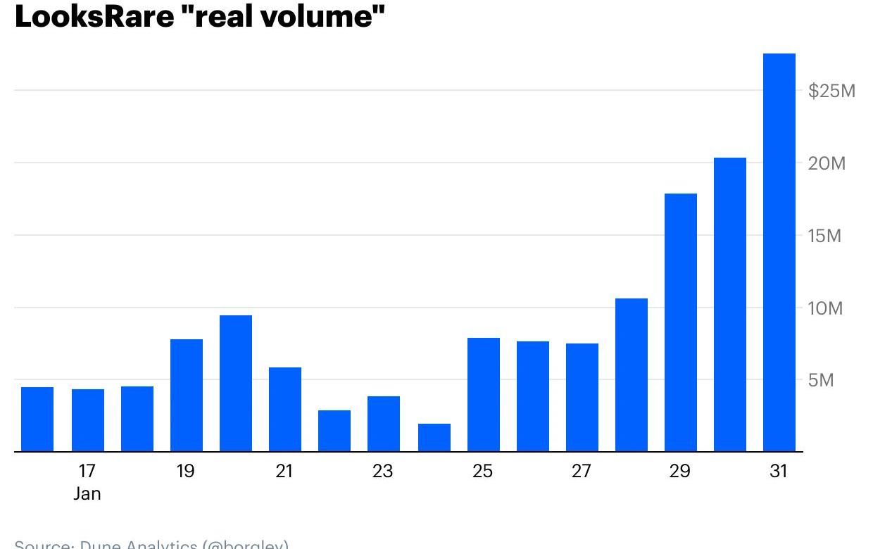 XRP/HKD-5.34%只有Crypto領域才會出現的現象是:一個由匿名創始人在幾周內建立起來的平臺,就能與業內處于領先地位的平臺進行抗衡。新上線的NFT平臺LooksRare便生動詮釋了這一現象,其1月份的交易量達到了90多億美元,幾乎是OpenSea同期交易量的三倍。不僅如此,在上線的30天內,LooksRare就取得了3.07億美元的協議收入,而同期OpenSea只有1.1億美元。然而,這些原始數據并不能反映全部的問題。