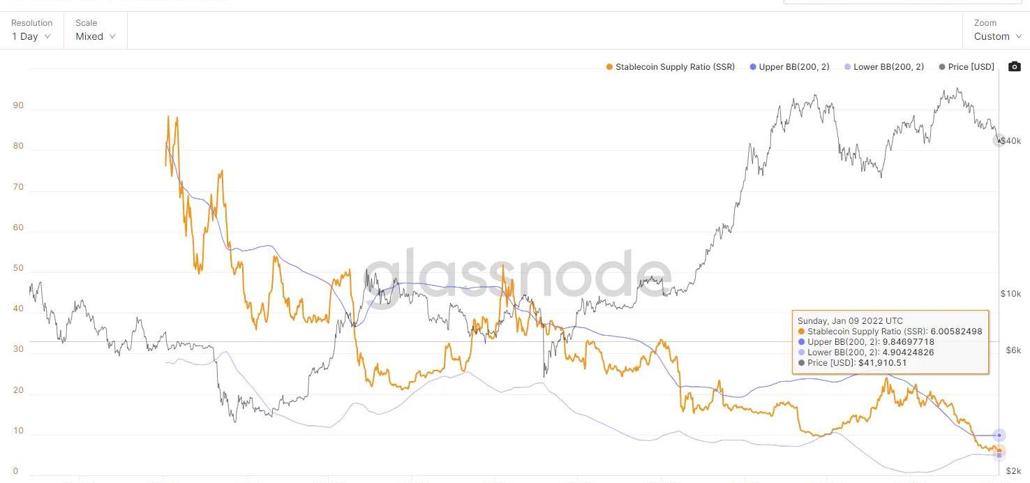 是比特幣供應量與以BTC表示的穩定幣供應量之間的比率,或:比特幣市值/穩定幣市值。我們使用以下穩定幣進行供應:USDT、TUSD、USDC、USDP、GUSD、DAI、SAI和BUSD。當SSR較低時,當前的穩定幣供應有更多的“購買力”來購買BTC。該指標快接近下軌,進入超跌狀態。