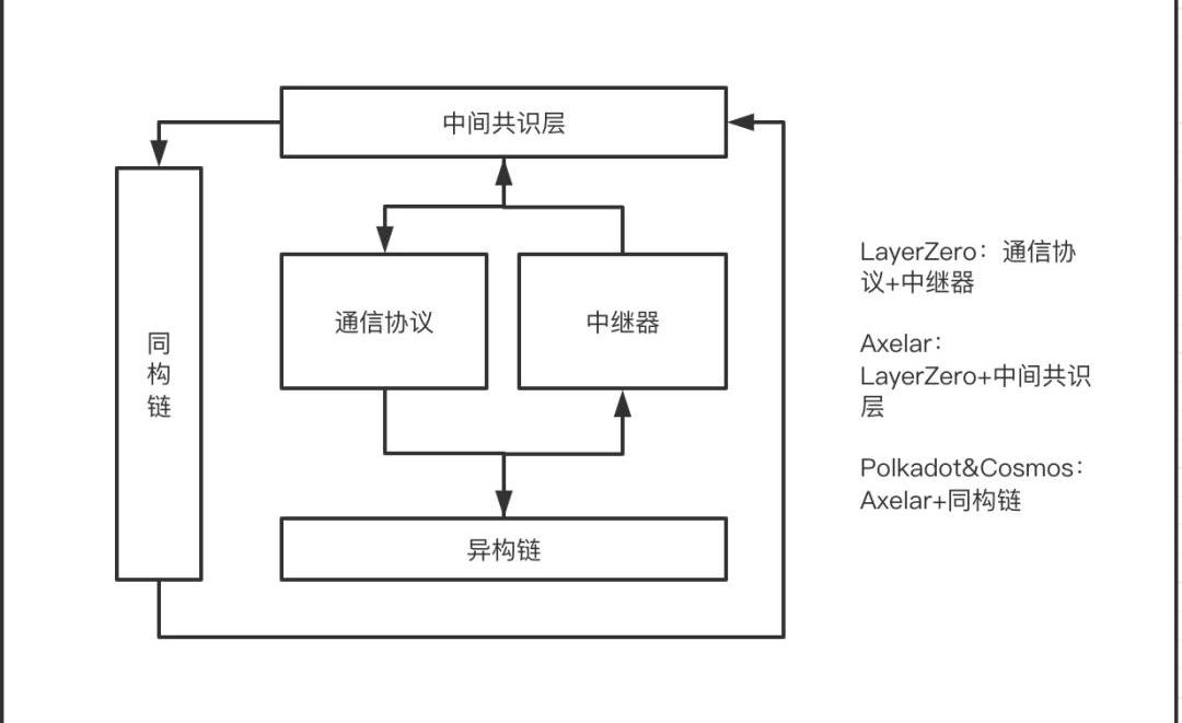 Polkadot和cosmos是這個市場上聲量最大,生態也最豐富,市值最高的項目。總體上來說,這兩個項目所闡述的價值觀和產品觀都遠高于前述的layerZero和Axelar。這里不討論Polkadot和Cosmos的具體方案,各種語言的文檔多如牛毛。我們從整體方案來做展示。Polkadot和Cosmos的敘事中都提到了異構鏈之間的跨鏈方案,比如substrate和Tendermint鏈與ETH,BTC等鏈之間的跨鏈,基本原理與Axelar和LayerZero并無太大不同,均需要一個中間共識層通過公證人機制完成跨鏈。但是Polkadot和cosmos講了另一個看起來更加有吸引力的故事——標準化區塊鏈和同構跨鏈方案。換個說法:再創生態的萬鏈互聯。2、與LayerZero&Axelar形態比對