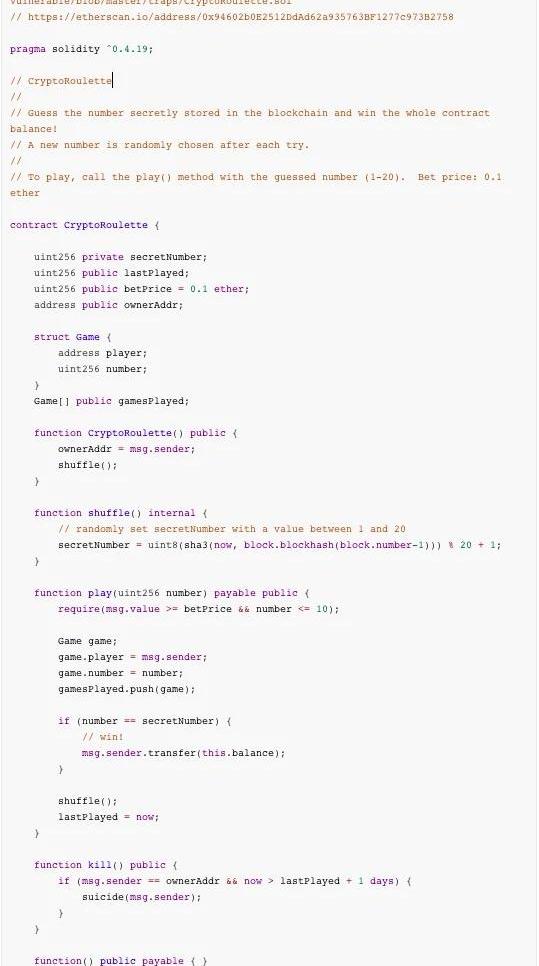 賭博行業從古至今一直存在,而區塊鏈的去中心化似乎給賭博行業帶了新的機會,它的進入會讓人們覺得賭博變得公平,然而我們都知道賭博結果往往都是必輸,那么接下來就通過分析四個基于區塊鏈的賭博游戲合約來介紹莊家是如何最后穩贏的。2.1加密輪盤賭輪:CryptoRoulette