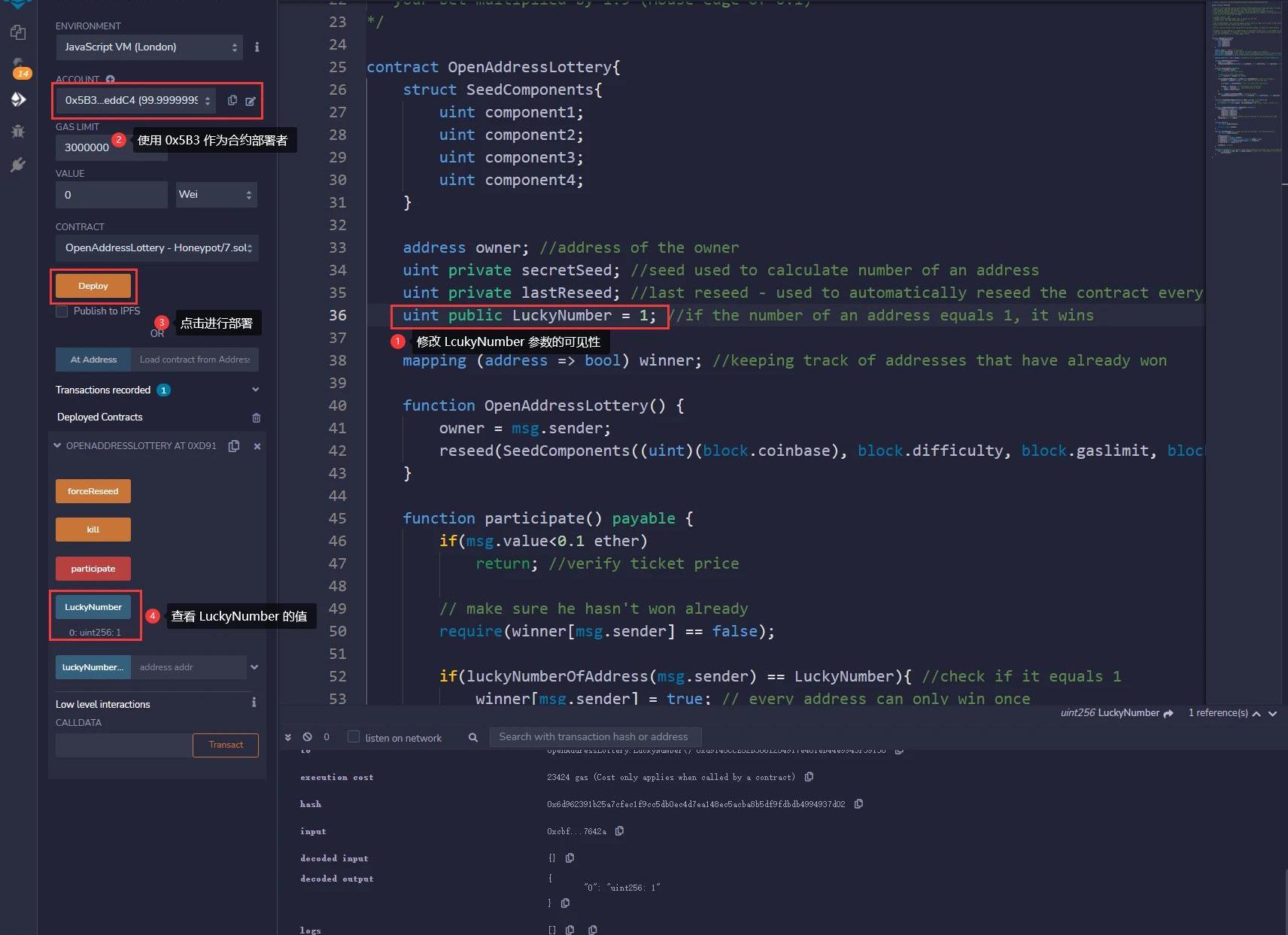 2.2.2代碼復現將蜜罐合約的代碼復制到RemixIDE中,為了方便我們查看LuckyNumber的值,我們將LuckyNumber的類型設置為public,這樣就可以在RemixIDE中就有獲取其值的getter()函數了。同樣的,蜜罐部署者也可以將該變量設置為public屬性讓攻擊者誤以為有利可圖,因為LuckyNumber的值會被覆蓋永遠為7。使用地址0x5B3點擊「Deploy」部署合約,調用LuckyNumber查看其值為1,由于這里還沒有初始化SeedComponent結構體也就不會覆蓋掉LuckyNumber的值,所以它還是1。