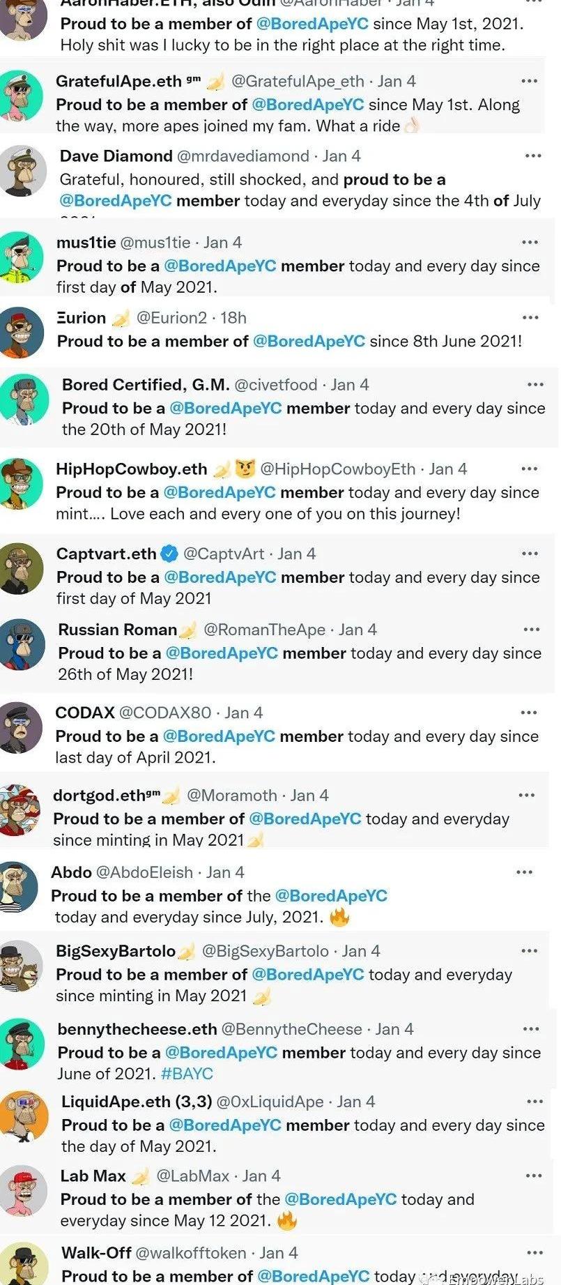 我看過很多社區,但沒有一個從傳播層面上達到了無聊猿的程度。這一切到底是怎么發生的,我沒有結論。但很容易就能觀察到的一點是,猿猴們正在席卷Twitter空間,他們把twitter當做了傳播品牌和文化的主戰場。在Twitter上什么#apefollowape#apetogetherstrong之類的標簽層出不窮,并且熱度很高。由于支持猿猴的成員散落在各行各業,而不是局限在加密行業,他們的傳播能夠觸達到很多民眾。人們會好奇,為什么最近老能看見這只丑丑的猴子。就最近幾天又有很多猴子在twitter上自發來了次“驕傲加入猴俱樂部”傳播。